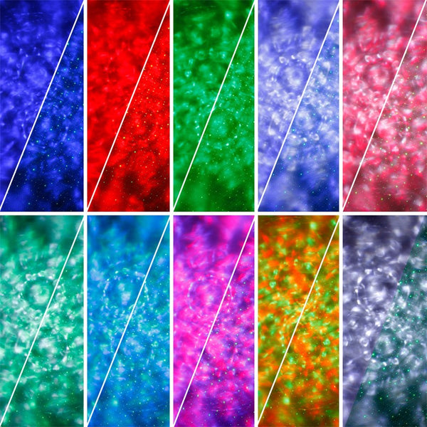 Efecto de Nebulosa Realista: Proyecta nubes, olas y miles de estrellas con movimiento dinámico en múltiples colores (principalmente azul).